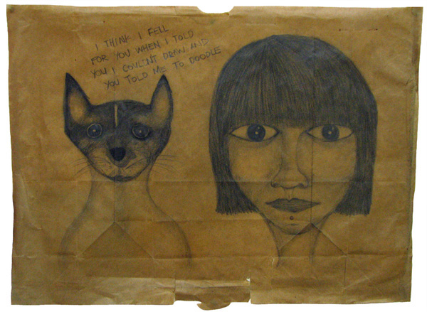 Drawn on a brown paper bag.